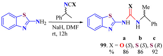 - Padilla-Martínez, I.I.; González-Encarnación, J.M.; García-Báez, E.B.; Cruz, A.; Ramos-Organillo, A.A. Isothioureas, Ureas and their N-methylamides From 2-Aminobenzothiazole and Chiral Aminoacids. Molecules 2019, 24, 3391. [Google Scholar] [CrossRef]