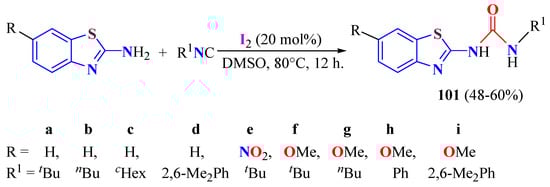 - Ahmadi, F.; Imani, K.; Mozafari, H.; Bazgir, A. Metal-free isocyanide insertion reaction to benzothiazolyl urea derivatives. J. Mol. Struct. 2022, 1256, 132557. [Google Scholar] [CrossRef]