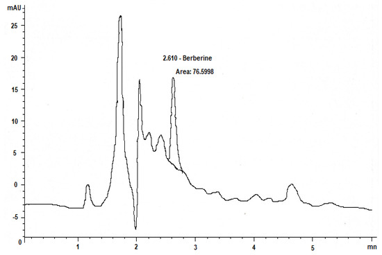 Berberis vulgaris extracts contain a high concentration of polyphenols. Comparison with reference compounds, analysis of scientific literature, and investigations on their mechanism of fragmentation led to the provisional identification of 23 different secondary metabolites in different plant organs. The highest concentration was discovered for derivatives of benzoic and cinnamic acids among the identified polyphenol-flavonoid components. Table 1 displays the complete list of detected metabolites in the examined samples, including simple organic acids and sugar acids from various organs of Berberis vulgaris. Simple phenolic compounds were detected in the chromatograms of Berberis vulgaris root samples. The roots had trace amounts of quercetin, vanillic acid, and rosmarinic acid in addition to caffeic acid, chlorogenic acid, myricetin, and catechin derivatives. The results of this study corroborated those of previous investigations into the alkaloid profile of this species [31]. HPLC chromatographic study shows that there is 0.6 mg of the active component berberine per 1 mg of Berberis vulgaris extract (Figure 1). After determining that 19 and 45 mg/mL of berberine could be detected and quantified, respectively, these values were kept as constants. Concerns about the potential side effects of synthetic medication have prompted a rise in the use of natural materials as an adjunct to conventional therapy for the restoration and treatment of various illnesses in recent years. Since the roots and leaves of the Berberis vulgaris plant exhibited significant antioxidant activity, we used high-performance liquid chromatography to analyses them for the presence and concentration of phenolic compounds. Gallic acid, berberine, chlorogenic acid, vanillic acid, caffeic acid, syringic acid, rutin, p-coumaric acid, catechin, myricetin, and kaempferol were found in high concentrations of 18.2, 45.5, 75.2, 2.2, 33.5, 3.9, 8.1, 2.14, 40.2, 12.4, and 23.14 mg/mL extract, respectively. The most prevalent phenolic components in Berberis vulgaris roots and leaf extracts were identified to be chlorogenic acid, berberine, catechin, and caffeic acid. Kaempferol, rosmarinic acid, myricetin, luteolin, and p-coumaric acid were found in low amounts (Table 2). Kaempferol was the most prevalent flavonoid in Berberis vulgaris roots extract, with 23 mg/mL, followed by luteolin (19.7 mg/mL), and myricetin (12.5 mg/mL). Overall, barberry root extract contained more phenolic and flavonoid components than barberry leaf extract. Previous research has found that the greatest quantities of gallic acid, catechin, chlorogenic acid, vanillic, caffeic, syringic, ferulic acid, rutin, and o-coumaric in Jilin’s fruits were 0.182 g kg−1, 0.640 g kg−1, 0.624 g kg−1, 0.044 g kg−1, 0.089 g kg−1, 0.049 g kg−1, 0.031 g kg−1, 0.073 g kg−1,and 0.051 g kg−1, respectively [32]. Root extracts are rich in berberine, chlorogenic acid, and other alkaloid derivatives. Ethanol extracts from the roots contained the most isoquinolines, with 14% berberine, 23% chlorogenic acid, and 12.4% catechin. Our results are slightly above the typical alkaloid level in Berberis spp. based on these and other studies [33].