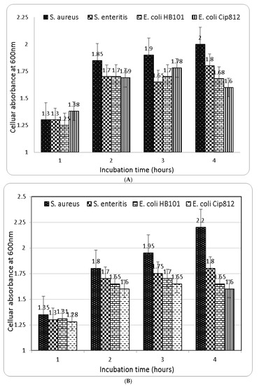 Using the Brain Heart Infusion (BHI) media, a preculture of every examined bacterial strain was generated for 24 h. A portion of 50 μL of preculture was combined with 50 mL of sterilized BHI media in a 250 mL Erlenmeyer flask. The mixture was continually stirred at the appropriate temperature of the examined bacterial strains until the optical absorbance of the media reached 0.5 at 600 nm. Then, 4 mL of the resulting suspension was added to each tube with 80 mL of the tested compound (5 mg/mL) for a final substance concentration of 100 g/mL. The tubes were kept at the optimum temperature for every investigated strain for 0, 1, 2, 3 and 4 h, respectively. The optical absorption at 600 nm was measured and taken as a metric of bacterial growth, with a decrease in absorption indicating bacterial suppression.