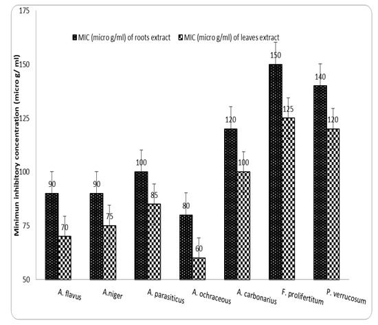 Minimum inhibitory concentration of Berberis vulgaris roots and leaf extracts for examined fungi.
