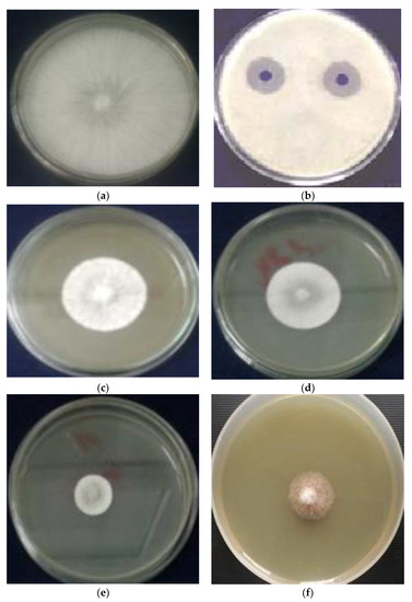 The effect of Berberis vulgaris extracts on fungal colony growth: (a) negative control; (b) positive control; (c) P. verecossum; (d) A. parasiticus; (e) A. carbomareous; and (f) F. proliferatum.