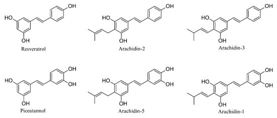 20. Sobolev, V.S.; Neff, S.A.; Gloer, J.B. New dimeric stilbenoids from fungal-challenged peanut (Arachis hypogaea) seeds. J. Agric. Food Chem. 2010, 58, 875–881. [Google Scholar] [CrossRef]