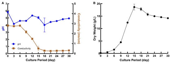 Previously, hairy roots of peanut were cultured in 250 mL flasks with 50 mL of MSV medium [2,17,18]. However, preliminary experiments suggested that a higher biomass of roots could be obtained by culturing the same amount of root inoculum into larger flasks with a higher volume of the medium. Therefore, the hairy roots were cultured in 500 mL flasks with 100 mL of MSV medium, and a thirty-day growth curve was established to identify the growth stages of the hairy roots grown under these conditions. The pH and conductivity of the medium were recorded during the 30 days to understand the behavior of the roots in the medium (Figure 2A). The conductivity of the medium decreased as the biomass increased, indicating that nutrients were taken up from the culture medium by the hairy roots during their growth. The rate of change in conductivity leveled off after the hairy roots reached their highest biomass on day 15. The pH dropped for the first three days, slowly increased for the next nine days, and then decreased again on day 18. From day 18 to the end of the growth curve period, the pH slowly increased. Based on the dry weight of the hairy roots, a lag phase of about 3 days was observed, followed by an exponential growth phase between days 3–15 and a stationary phase from day 15 to 30 (Figure 2B). The specific growth rate, growth index, and doubling times were calculated as 0.31 day−1, 107.33, and 2.22 days, respectively. The highest biomass attained was 18.63 ± 1.19 g DW/L at 15 days. The specific growth rate was found to be similar to that described for peanut hairy roots grown in 250 mL flasks [17].