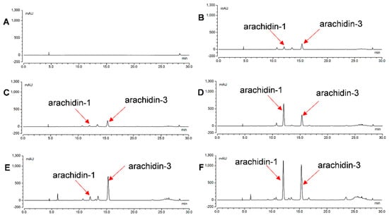 Figure 4. HPLC chromatograms of extracts from the medium of hairy root cultures of peanut upon elicitation treatment for 192 h with (A) control (without elicitors); (B) CD; (C) CD+MgCl2; (D) CD+H2O2; (E) CD+MeJA; and (F) CD+MgCl2+H2O2+MeJA. All chromatograms were monitored at 340 nm. CD: methyl-β-cyclodextrin; MeJA: methyl jasmonate.