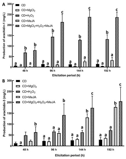 Figure 5. Comparison of (A) arachidin-1 and (B) arachidin-3 yield in hairy root cultures of peanut upon different elicitor treatments. Yield is expressed in mg/L of medium and each bar represents the average of three biological replicates and error bars represent standard deviation. Statistical analysis was performed using two-way ANOVA with Tukey’s multiple comparisons test. In each elicitation period, the lower-case letters above the column represent significant (between different letters) or non-significant (between the same letter) statistical differences. Significance level, p < 0.05. CD: methyl-β-cyclodextrin; MeJA: methyl jasmonate.