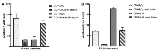 Figure 6. Comparison of (A) arachidin-1 and (B) arachidin-3 yield in hairy root cultures of peanut upon re-elicitation by CD+H2O2 and CD+MeJA. Yield is expressed in mg/L of medium and each bar represents the average of three biological replicates and error bars represent standard deviation. CD: methyl-β-cyclodextrin; MeJA: methyl jasmonate.
