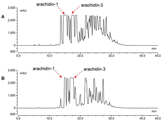 Figure 7. Semi-preparative HPLC chromatograms of 6:4 (MeCN:0.5%HCO2H) octadecylsilane (ODS) fraction from hairy root cultures of peanut elicited with (A) CD+H2O2 and (B) CD+MeJA. CD: methyl-β-cyclodextrin; MeJA: methyl jasmonate.