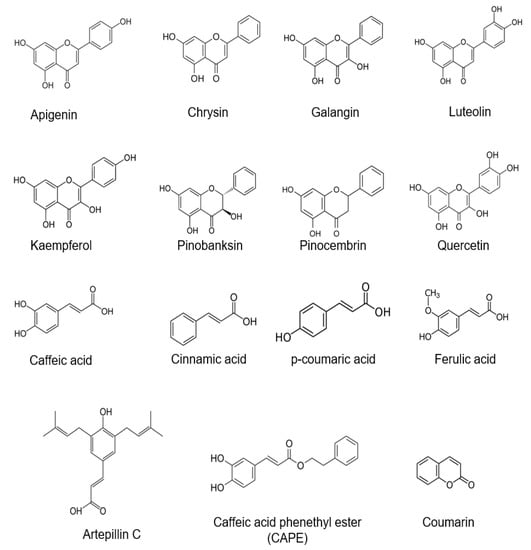 | Cancer | Apigenin, artepillin C, caffeic acid, CAPE, chrysin, galangin, kaempferol, luteolin, myricetin, pinocembrin, and quercetin |
