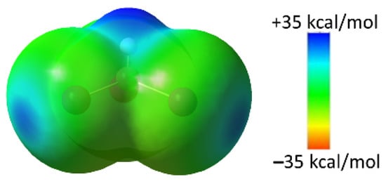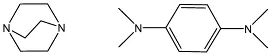 Surface electrostatic potentials of TMPD and DABCO are illustrated in Figure 5. Both these molecules show areas of negative potentials corresponding to the location of lone pairs on the surface of the nitrogen atoms. The magnitude of the minimum (most negative) potential, VS,min, of −36.4 kcal/mol on the surface of DABCO is somewhat higher than that on the surface of the nitrogen atom of TMPD (−33.2 kcal/mol), apparently due to the partial delocalization of nitrogen’s lone pairs to the aromatic ring in the latter.