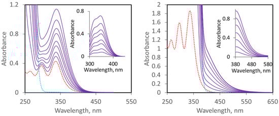 Although the UV–Vis spectrum of DABCO is transparent at λ > 300 nm, an addition of this amine to an acetonitrile solution containing iodoform resulted in an increase in absorption in the 300–400 nm range. The subtraction of the absorption of each component showed that this increase is related to the appearance of a pair of close absorption bands (Figure 2). In solutions with a constant concentration of iodoform, the intensity of these bands increased with the increase in concentration of DABCO. The addition of DABCO to bromoform also resulted in the appearance of a new absorption band in the UV–Vis spectra, as described earlier [24]. This new band is substantially blue-shifted compared with that observed with CHI3, and it was partially overshadowed by the absorption of DABCO itself. In comparison, solutions of DABCO and CHCl3 did not show any new absorption beyond 280 nm (spectra of the solutions containing CHCl3 and DABCO are the same as the spectra of individual DABCO), and the strong absorption of DABCO hinders measurements below this wavelength.
