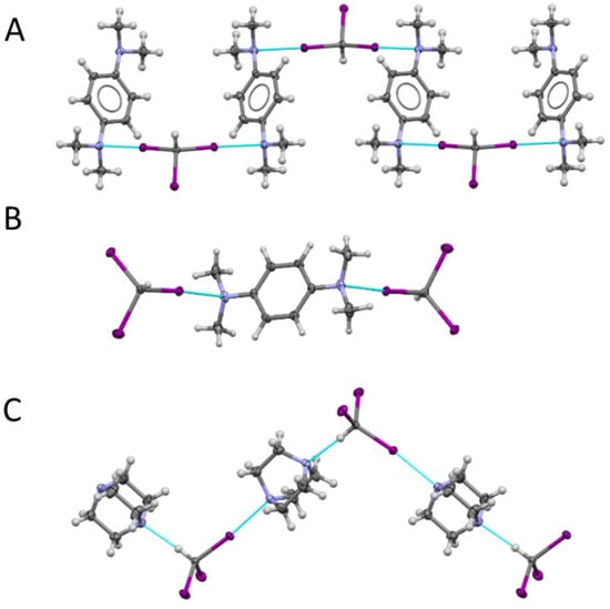 Cooling down acetonitrile solutions containing equimolar quantities of iodoform and either TMPD or DABCO led to formation of co-crystals suitable for X-ray structural measurements. X-ray analysis showed that these co-crystals comprise zigzag chains consisting of alternating iodoform and either TMPD or DABCO molecules (Figure 4A,C). Co-crystallization of CHI3 with TMPD also produced discrete 2:1 complexes (Figure 4B).