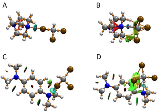 Superposition of the results QTAIM and NCI analyses onto the structures of the XB complexes of CHBr3 with DABCO (A) and TMPD (C) and HB complexes with DABCO (B) and TMPD (D). The bond paths and critical (3,−1) points (from QTAIM) are shown as orange lines and spheres, respectively, and blue-green discs indicate areas of bonding interactions (from NCI).