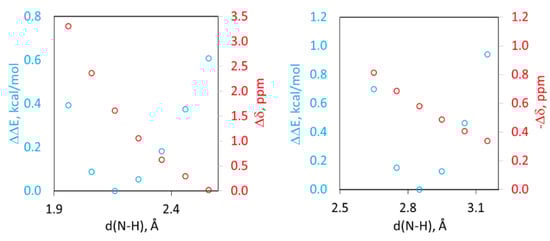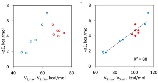 It should be noted, however, that the presence of the electron-rich species near the haloforms may substantially affect electron distributions in these species (and the same is true for the amines). Such polarization represents an important factor in the strength of intermolecular complexes [35]. Thus, we evaluated electrostatic potentials on the surfaces of haloforms in the presence of the partial charge located at the positions of the bonded nitrogen atoms in the HB and XB complexes (see Experimental for details). The values of VS,max on the surface of halogen and hydrogen atoms in the presence of the charges are substantially higher than those of the individual molecules (see Table S1 in the Supplementary Materials). The corresponding correlation between ΔE and VS,max − VS,min values calculated using VS,max in the polarized CHX3 molecules is shown in Figure 9 (right) as the filled circles. While this approach takes into account only the polarization of haloforms, it considerably improves the correlation. The points corresponding to the HB complexes follow the same trend line as the XB associations (with R2 = 0.88 for the whole series). This indicates that once polarization is taken into account, the strengths of the HB and XB complexes between haloforms and aromatic and aliphatic amines can be uniformly related to the electrostatic potentials on the surfaces of HB/XB donors and acceptors.