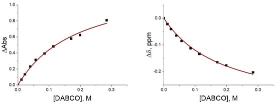 Dependencies of the ΔAbs and Δδ values in the solutions with constant concentration of CHI3 (0.01 M) and variable concentrations of DABCO. Solid lines show the simultaneous multivariable fitting of the UV–Vis and NMR titrations data.
