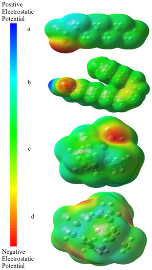 Molecular electrostatic potential (MEP) can be thought of as a tool for investigating the charge distribution of atoms on the surface of the molecule and is related to electronic density. Its maps provide an insight into the biological recognition processes, hydrogen bond interactions, and the reactivity of a wide variety of chemical systems in nucleophilic and electrophilic reactions [40]. MEP maps show different colors due to various electrostatic potentials on the surface. The decreasing order of electrostatic potential is blue > green > yellow > orange > red. In the MEP maps, the red-colored regions show the most negative electrostatic potential, the green-colored regions show the zero potential, and the blue-colored regions show the most positive electrostatic potential. The red- and yellow-colored regions (negative electrostatic potential) on the MEP surface are associated with electrophilic reactivity, while the blue-colored regions (positive electrostatic potential) of MEP are associated with nucleophilic reactivity. Looking at Figure 4a, the hydrogen atoms (17H, 18H, and 22H) attached to the carbonyl group have a positive electron density and are shown in blue, while the oxygen atom (1O) in the carbonyl group has a negative electron density and is shown in red. In Figure 4b, the hydrogen atom (52H) attached to the oxygen atom has the most positive electron density and is shown in blue, while the oxygen atom in the carbonyl group (2O) has the most negative electron density and is shown in red. In Figure 4c,d, the most negative electron density is on the vinyl groups and is shown in red.