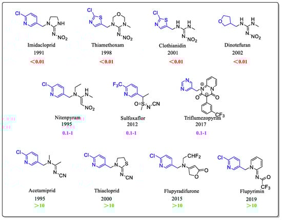 - Matsuda, K.; Ihara, M.; Sattelle, D.B. Neonicotinoid Insecticides: Molecular Targets, Resistance, and Toxicity. Annu. Rev. Pharmacol. Toxicol. 2020, 60, 241–255. [Google Scholar] [CrossRef] [PubMed]