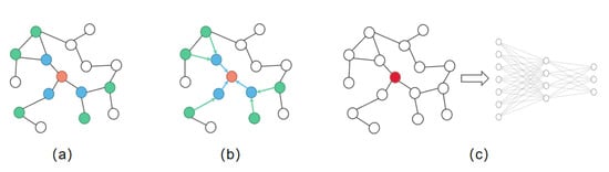 Graph convolution neural network. (a) Sample neighborhood. (b) Aggregate features from neighbors. (c) Taking the aggregated node features as the input of the neural network.