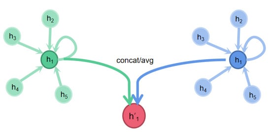 After calculating the attention coefficient of all the neighbors of node i and its own attention coefficient, we can calculate the new features of node i according to Equation (11).