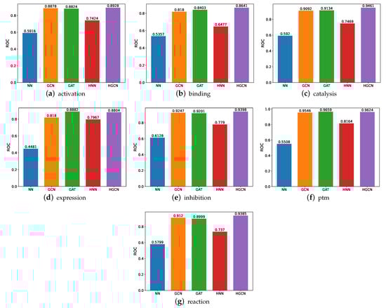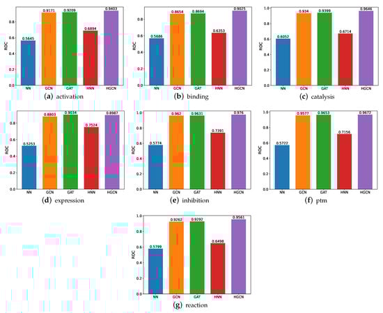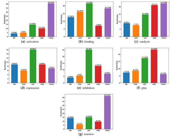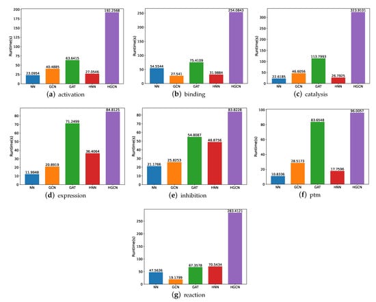 For the SHS148k dataset, we also carry out the runtime performance comparison, and the results are demonstrated in Figure 10. Based on these figures, we are able to deduce that the execution of these models takes a significantly longer amount of time. For example, for the experiments on the activation subsets, the HGCN demands 7 times the runtime on SHS148k than on SHS27k. For the catalysis subset, the HGCN method needs a runtime of 323 s on the SHS148k dataset. This is over 15 times longer than the runtime required for the SHS27k dataset, which requires only 22 s for the experiments to be carried out.