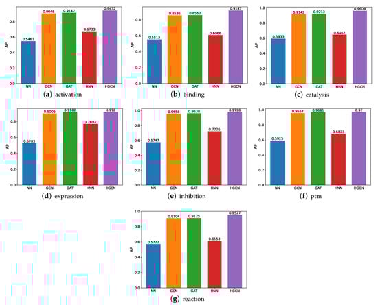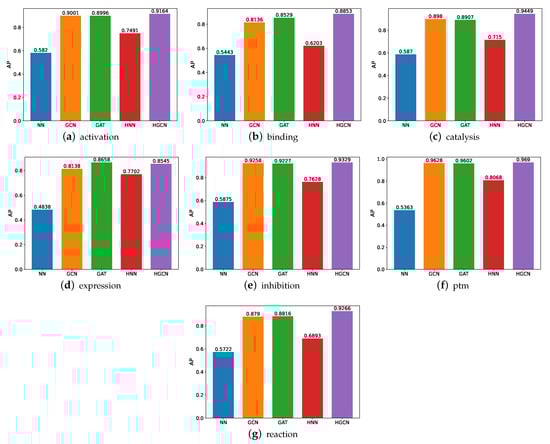 The AP comparison performance is also carried out, and the experimental results are shown in Figure 9. On the basis of these results, we can see that, similar to the performance on SHS27k, the HGCN gains the best performance compared with the other models on all the SHS148k subsets in regard to the AP metric. In addition, we observe that the HGCN can achieve a comparable prediction performance on the activation, catalysis, inhibition, ptm, and reaction subsets of SHS148k. Meanwhile, for the SHS27k dataset, this model obtains a comparable performance on the catalysis, inhibition, and ptm subsets. It is possible that the larger dataset helps bring a better prediction performance.