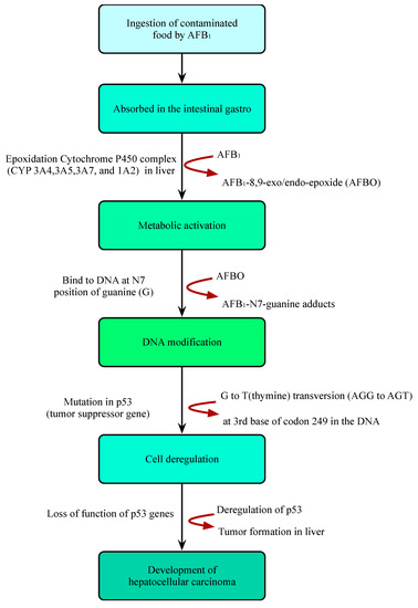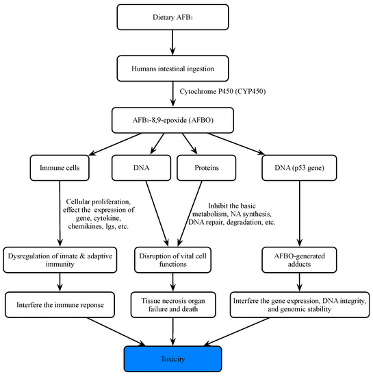 AFB1 is a powerful carcinogenic, teratogenic, mutagenic, immunotoxic, hepatotoxic, and reproducible poison. Previous studies have shown that the toxicity of AFB1 is 10, 68, and 416 times that of KCN, arsenic and melamine, respectively [43,44] (Figure 2). Therefore, AFB1 has been classified as a class 1 carcinogen by many international authoritative organizations or institutions [45,46]. Due to the structural double bonds in the furan ring, AFB1 has high carcinogenicity and toxicity [17,47]. The lipophilic structure of atrial fibrillation promotes its entry into the blood through gastrointestinal and respiratory tracts [48,49]. Once AFB1 enters blood, it is distributed in various tissues and accumulates in the liver or other organs, resulting in liver cancer (Figure 3). In the liver, AFB1 produces a variety of metabolites through the hydroxylation and demethylation of the first-stage drug metabolism enzymes (for example, cytochrome P450 oxidase and CYP450 superfamily members, such as CYP1A2, CYP3A4, and CYP2A6) [50]. Metabolic reaction (internal and external) activates the final carcinogen AFB1 -8,9-epoxy metabolite, which covalently binds to cellular macromolecules (DNA, RNA, or protein) and plays a key role in acute and chronic poisoning. AFB1 residues also destroy the function of tumor suppressor genes (p53 and Rb) in the liver, which affects normal cells and leads to liver injury, increasing the probability of tumor and liver cirrhosis [51,52,53,54,55]. It is estimated that about 30% of liver cancers in the world are caused by AFB1. Its toxicity increases the infection rate of hepatitis B virus (HBV) and the risk of liver cancer [56]. A recent study found that the synergistic effect of AFB1 and HBV leads to liver cancer [50]. The reason is that HBV infection directly or indirectly exposes hepatocytes to AFB1 sensitive to tumors. The toxic effect of AFB1 is also related to dose, age, sex, nutrition, exposure time, and type [57]. In addition, AFB1 can be transmitted to the fetus through the placenta and affect the health of infants [58]. AFB1 exposure also inhibits immunity, thereby increasing the susceptibility to immunodeficiency virus attack and the probability of infection with other infectious diseases [59,60,61,62,63].