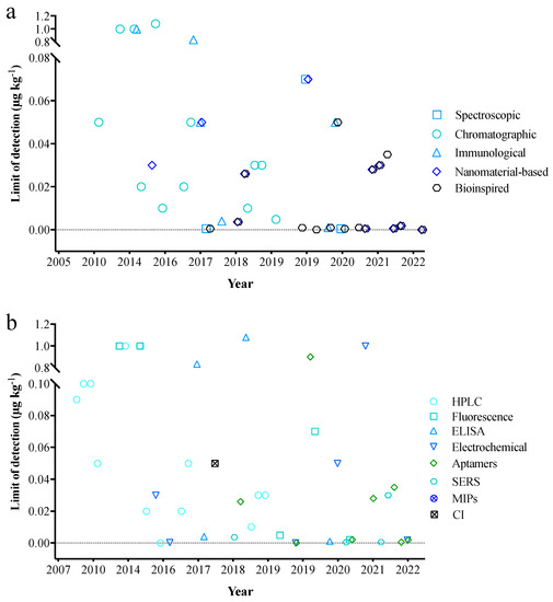 Timeline of the limit of detection on AFB1 in edible oil by different (a) detection technology and (b) detection method. CI: Chemiluminescence immunoassay.