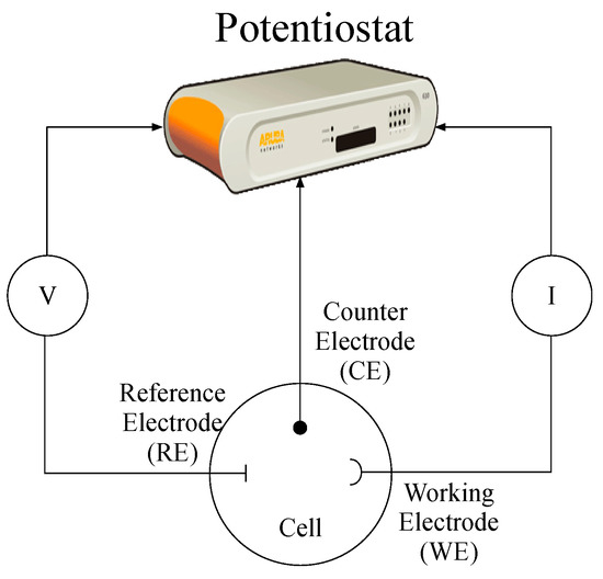 Scheme of the two or three-electrode setup used in electrochemical methods.