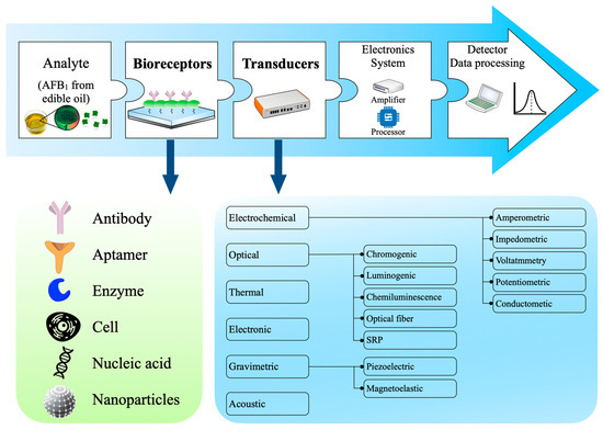 A biosensor is independent quantitative analysis equipment used to study the analytes required in different types of food samples. A biosensor consists of many parts [29,30] (Figure 6). Biometric elements are the core components of biosensors and can detect specific target analytes. The quality of biometric elements usually determines the specificity and sensitivity of analysis [200,201]. Biorecognition elements, including antibodies, aptamers, molecularly imprinted polymers, and enzymes, have been used to manufacture biosensors [34,64,202]. These elements show increased sensitivity and selectivity for target analytes. Critical biometric elements for developing biosensors to detect AFB1 in edible vegetable oil are elaborated below.