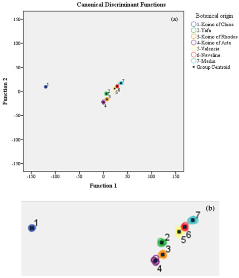 (a) Differentiation of fresh orange juice according to variety based on the combination of conventional physico-chemical parameters, flavonoids, and volatile compounds, using LDA. (b) Blow up of Figure 2a.
