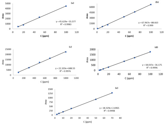 Standard curves of flavonoids: (a) quercetin (10–100 ppm), (b) naringenin (1–100 ppm), (c) hesperidin (100–1000 ppm), (d) naringin (2.5–100 ppm), and (e) neohesperidin (2.5–70 ppm).