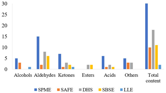 Number of volatile compounds measured by GC × GC-O-MS for five extraction methods.