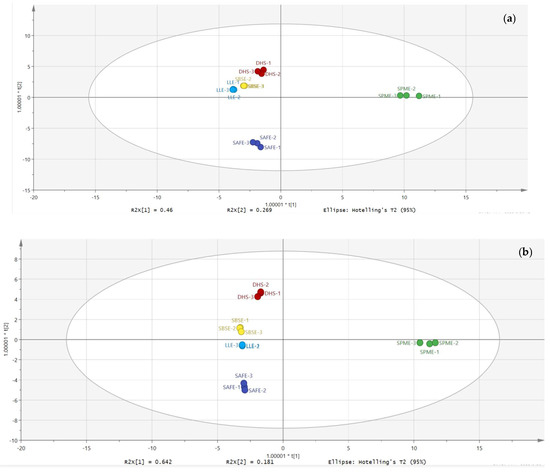 To better determine the best method for the extraction of volatile compounds, OPLS-DA was chosen for further differentiation. As shown in Figure 3a,b, the OPLS-DA analysis showed that SPME was better differentiated from the other four extraction methods. In 1D mode, LLE could not be distinguished from SBSE. In 2D mode, three extraction methods cannot be distinguished, namely DHS, LLE and SBSE.