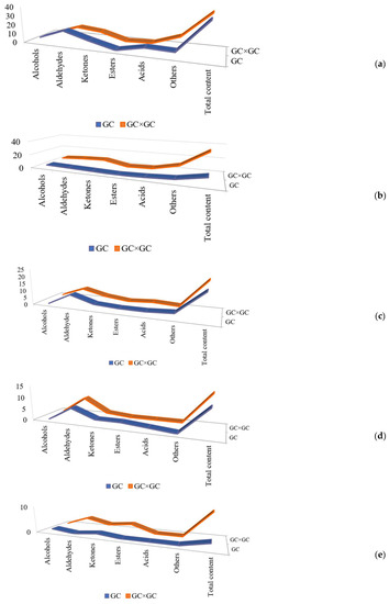 Five extraction methods combined with GC and GC × GC to measure the amount of volatile compounds. (a) SPME combined with GC and GC × GC to measure the amount of volatile compounds; (b) SAFE combined with GC and GC × GC to measure the amount of volatile compounds; (c) DHS combined with GC and GC × GC to measure the amount of volatile compounds; (d) SBSE combined with GC and GC × GC to measure the amount of volatile compounds; (e) LLE combined with GC and GC × GC to measure the amount of volatile compounds.