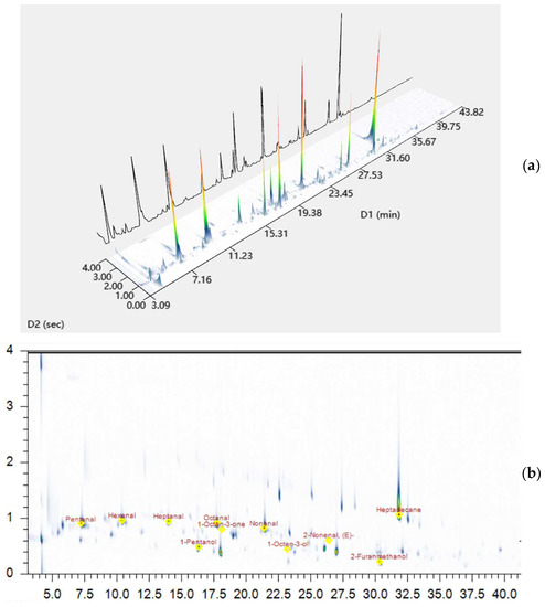 As shown in Figure 4a–e, among the five extraction methods, more compounds were detected in 2D mode than in 1D mode. As shown in Table 1, the relative content of the compounds analyzed by the 2D model was also higher. The 3D view of the 2D mode was presented in Figure 5a,b. Specifically, 9 compounds, such as decanal, dimethyl trisulfide, and 2,5-dimethylpyrazine, were not analyzed in the 1D mode, but several of these substances could be identified in the 2D mode and could be analyzed in the sniffing port. Interestingly, it was observed that 1-octen-3-one can be smelled but not identified in the 1D mode, which does not reach the detection limit of the instrument, while it can be both analyzed and smelled in the 2D mode, which further confirms the high resolution of the 2D mode. In addition, other substances, such as 1-octen-3-ol, acetic acid, and (E)-2-octenal, can be analyzed in the 1D mode but cannot be identified in the sniffing port, while these compounds can be easily analyzed and sniffed in the 2D mode. Some compounds such as furfural, (E,Z)-2,6-nonadienal, and 4-hydroxy-2,5-dimethyl-3(2H) furanone, which were not identified in 2D mode, could be analyzed or smelled in the 1D mode. Clearly, the above results revealed that the use of both analytical methods can analyze the odor compounds in the samples more comprehensively.