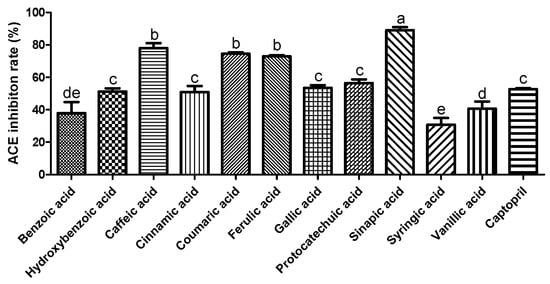 Inhibitory effect of selected phenolic acids (10 mM) on angiotensin I converting enzyme. Captopril (1.15 µM) was used as positive control. Each value was expressed as the mean ± standard error (n = 3). Different letters above the bars indicate significant differences based on the Duncan’s test (p < 0.05).