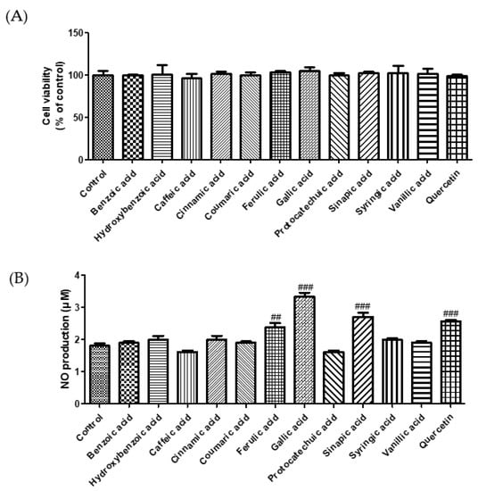Effect of selected phenolic acids (50 μM) on cell cytotoxicity (A) and NO production (B) in EA.hy 926 cells. Quercetin (25 μM) was used as positive control. Each value was expressed as the mean ± standard error (n = 3). Statistical significance was analyzed using the Tukey test. ## p < 0.01 and ### p < 0.001 versus nontreated cells.