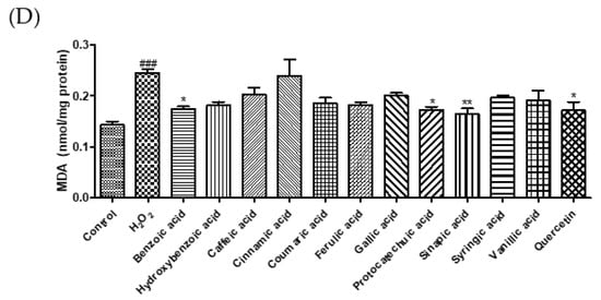 Effect of selected phenolic acids (50 μM) on cell viability (A), the generation of reactive oxygen species (B), glutathione (C), and malondialdehyde (D) against hydrogen peroxide (600 μM) in EA.hy 926 cells. Quercetin (25 μM) was used as positive control. Each value was expressed as the mean ± standard error (n = 3). Statistical significance was analyzed using the Tukey test. ### p < 0.001 versus nontreated cells. * p < 0.05, ** p < 0.01, and *** p < 0.001 versus hydrogen-peroxide-treated cells.