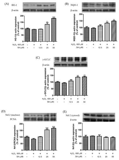Effect of sinapic acids on HO-1 (A), NQO-1 (B), and GCLC (C) protein expression and Nrf-2 expression levels in nucleus (D) and cytosol (E) against hydrogen peroxide (600 μM) in EA.hy 926 cells. Each value was expressed as the mean ± standard error (n = 3). Statistical significance was analyzed using the Tukey test. * p < 0.05, ** p < 0.01, and *** p < 0.001 versus hydrogen-peroxide-treated cells.