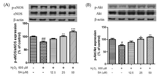 Effect of sinapic acids on p-eNOS (A) and p-Akt (B) protein expression against hydrogen peroxide (600 μM) in EA.hy 926 cells. Each value was expressed as the mean ± standard error (n = 3). Statistical significance was analyzed using the Tukey test. # p < 0.05 and ## p < 0.01 versus nontreated cells. * p < 0.05, ** p < 0.01, and *** p < 0.001 versus hydrogen-peroxide-treated cells.