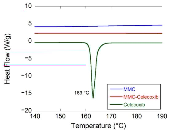 Differential scanning calorimetry (DSC) analyses were performed with a DSC Q2000 instrument (TA Instruments, New Castle, DE, USA) on MMC before and after the incorporation of the drug. In addition, the crystalline celecoxib was also studied by DSC. Samples of 4.9–7.8 mg were weighed into 5 mm aluminum pans and were hermetically sealed. Samples were first cooled to −35 °C for stabilization and then heated to 250 °C at a heating rate of 10 °C/min. Indium (melting point of 156.6 °C and melt enthalpy of 28.4 mJ/mg) was used to calibrate the temperature scale and the enthalpic response.