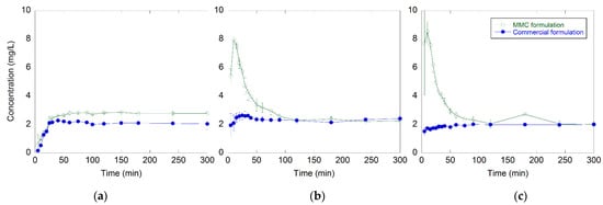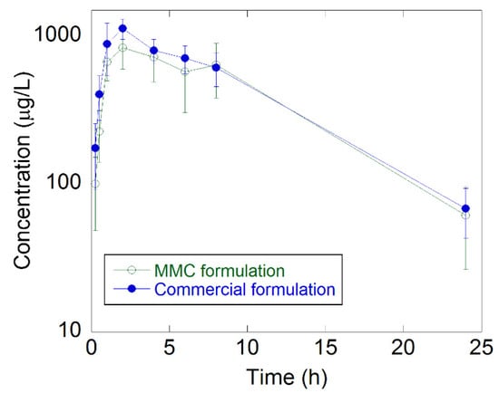 Plasma concentration–time curves for the MMC and the commercially available formulation. The error bars are based on n = 6.
