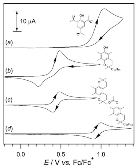 - Yao, W.W.; Peng, H.M.; Webster, R.D.; Gill, P.M.W. Variable Scan Rate Cyclic Voltammetry and Theoretical Studies on Tocopherol (Vitamin E) Model Compounds. J. Phys. Chem. B 2008, 112, 6847–6855. [Google Scholar] [CrossRef][Green Version]