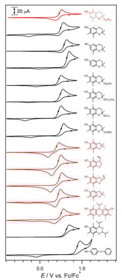Having established that the high chemical stability of the diamagnetic cation derived from oxidation of the parent α–TOH was unusual compared to most other related compounds that typically have lifetimes in the microseconds [,,,,,], experiments were conducted to determine how much the structure could be changed whilst still allowing the oxidative production of a stable diamagnetic cation. For these experiments, a range of phenolic compounds were prepared with structures similar to α–TOH, but with different functional groups or atoms placed around the chroman-6-ol structure (Scheme 5) []. The compounds in Scheme 5 were all synthesized except for β–TOH, which is the natural compound and is drawn in the top left-hand corner (there is currently no published synthetic procedure for the model form of β–TOH where the phytyl chain is replaced with a methyl group) []. Evidence for the formation of a long-lived diamagnetic cation having a lifetime of at least few seconds came from cyclic voltammetry (CV) experiments. If a forward and reverse peak were detected during CV experiments at a scan rate of 0.1 V s−1 similar to that seen for α–TOH, then it was taken as confirmation of the existence of the diamagnetic cation that could be reduced back to the starting material (Figure 3) [,].
