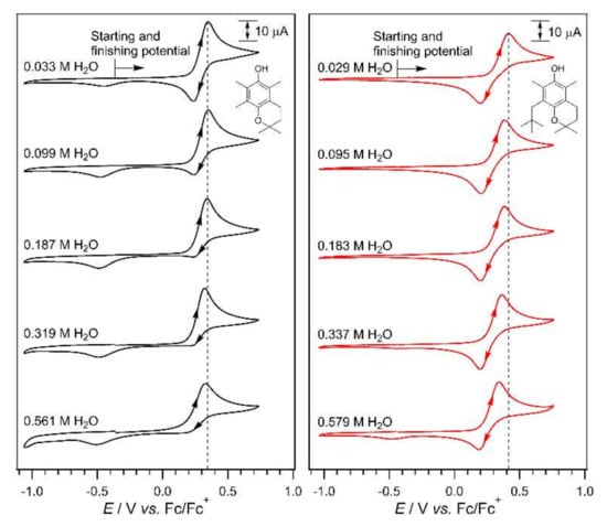 Voltammetric experiments with corresponding digital simulations were subsequently carried out on (CH3)α–TOH in CH3CN in the presence of carefully controlled water contents in order to determine the rate constant for the hydrolysis reaction of (CH3)α–TO+ with H2O and measure how hydrogen bonding affected the electrode potentials []. It was found that as water (between 0.010 M to 6 M) was progressively added to the CH3CN, the oxidation peak of (CH3)α–TOH moved progressively towards more negative potentials due to hydrogen bonding between the phenolic hydrogen atom on (CH3)α–TOH and the oxygen atoms in the water molecules [,,]. It was also found that the reductive (ipred) to oxidative (ipox) peak current ratio (ipred/ipox) for the oxidation process decreased as water was added to the solvent due to the (CH3)α–TO+ reacting irreversibly with H2O to ultimately form the quinone [(CH3)α–TOQ] (compound 10 in Scheme 2) and therefore, (CH3)α–TO+ not being able to be reduced back to the starting material. By varying the voltammetric scan rate and water content and modelling the data with digital simulation techniques, an estimate of the rate of reaction of (CH3)α–TO+ with H2O was made of 11 L mol−1 s−1 at 25 °C [].