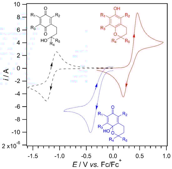 Representative voltammograms for oxidation of chroman-6-ol (red) and reduction of its associated hydroxy para–quinone hemiketal (blue) and para–quinone (black).