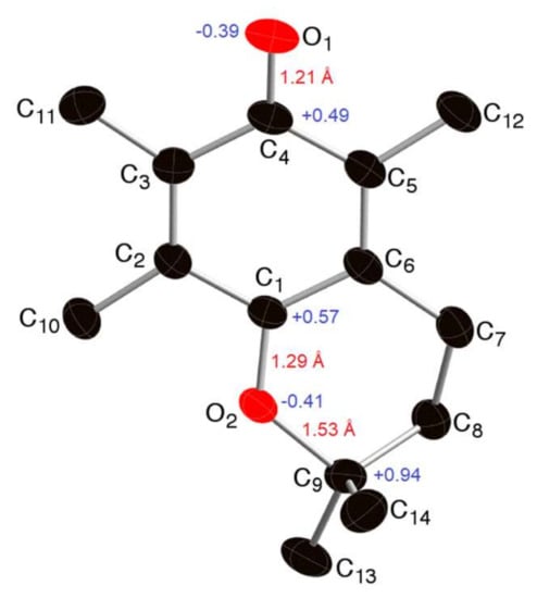 The ortho–quinone methide (compound 12 in Scheme 2) is also worthy of special attention as it has been shown to have an uncharacteristically long lifetime compared to related compounds, albeit in solution at very low temperatures. Rosenau et al. were able to generate the ortho–quinone methide of the (CH3)α–TOH model compound by chemical oxidation with Ag2O or Br2 that survived in CH2Cl2 at −78 °C for several seconds and reported that it could be converted back to (CH3)α–TOH under reducing conditions []. In Scheme 2 the formation of compound 12 is drawn as occurring through proton loss of the diamagnetic cation, but when using Ag2O or Br2 as oxidants, it is proposed to occur directly through proton loss from the methyl group in the phenoxyl radical []. It has also been reported that the ortho–quinone methide can exist in two forms that are electronically vastly different, with initially a zwitterionic intermediate formed through the chemical oxidation that converts into the ortho–quinone methide simply by a 90° bond rotation [].