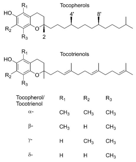 It is the 100-year anniversary of the discovery of vitamin E by Evans and Bishop [], who in 1922 proposed the existence of an unidentified species that was beneficial in the fertility of rats and aided in preventing the disintegration and assimilation of fetuses in the uterus (known as fetal resorption). The unidentified species was known to be present in certain types of foods such as vegetable oils and lipid-rich plant products, while rats which lacked these components in their diets suffered the fertility problems. Calhoun (a Professor of Greek) and Evans subsequently proposed the name tocopherol for vitamin E as a combination of the Greek words “tocos” meaning childbirth, “phero” meaning to bear, and “-ol” signifying that it is an alcohol []. The name vitamin E was given because it was the 5th (after A, B, C and D) essential vitamin micronutrient identified.