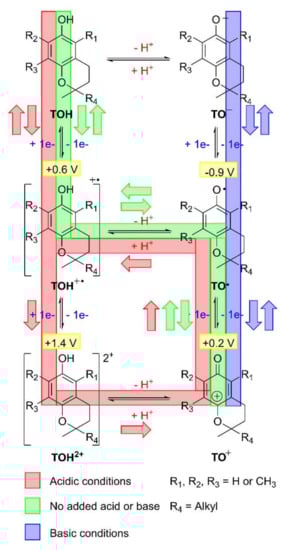 phenols; chromanols; phenolates; cation radicals; phenoxyl radicals; dications; diamagnetic cations; phenoxeniums; ortho–quinone methides; hydroxy para–quinone hemiketals; para-quinones; proton-coupled electron transfer (PCET); single electron transfer (SET); disproportionation; comproportionation; spectroelectrochemistry; bilayer membranes; cyclic voltammetry; chemical oxidation; photochemical oxidation 1. Introduction
