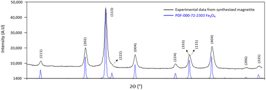 The characterization of the nanoparticles was carried out by powder X-ray diffraction (XRD) using an X-ray diffractometer (Model Empyrean from PANanalitical, Almelo, The Netherlands) (Figure 2). Data collection was performed using Co Kα (λ = 1.7890 nm) radiation (step time, 10 s; step size, 0.065°; 2θ angular range = 5–95°). The size of the particles was also determined by small-angle X-ray scattering (SAXS) (Model Empyrean from PANanalitical, Almelo, The Netherlands) in the same apparatus. Figure 2 shows the diffractogram of the synthesized MNPs in comparison with that reported in the literature and the ICDD PDF database file (International Center for Diffraction Data: PDF file number 72-2303) [34,35,36,37]. The diameter of the MNPs, determined by SAXS, approached 45 nm on average.